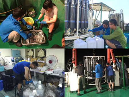 海洋研究小组三位研究生在船上的主要工作是采集海水样品,并且协助完成温盐深采水装置的室外操作——包过挂瓶、固定缆绳、拉采水装置上甲板等作业。本次科学考察中收获颇丰,共在35个站位取得分层海水样品250个、20L水样21个。海洋研究小组将对海水中的多种同位素进行测量,包括溶解无机放射性碳同位素(DI14C)、海水氢、氧同位素(δ2H,δ18O)以及10Be/9Be,这将有助于揭示南海海洋过程以及陆地与海洋的物质交换过程。