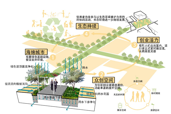 将成熟的海绵城市设施技术与城市公共交往空间理论结合,从规划的角度,进行众创空间导向的海绵城市实践模式的创新设计。