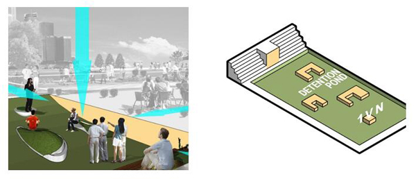 SPEECH POND的设计将海绵城市中的雨水收集系统运用与大型演说众创空间结合。通过运用地形,以及座椅的多样设置,创业者可以在这里进行创业创新理念的路演(1对N),自由、活力十足。干塘是一种能够暂时存储大量雨水的海绵设施,在不降雨的平时加入路演式交流的功能,实现设施的多功能利用与地区的可持续发展。