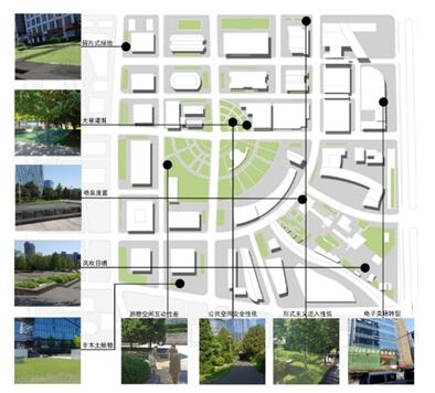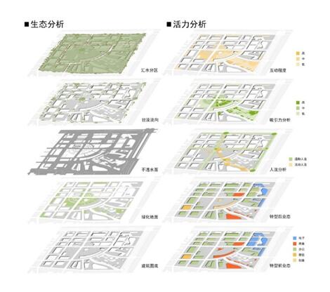 对中关村西区进行海绵城市建设的建筑布局现状、绿化地面、不透水面、坡向的分析从而划定汇水分区。并从人流、吸引力、互动程度对地块公共空间进行评价,为之后的模式布置提供依据。