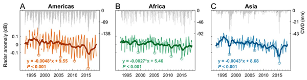图1. 全球现存雨林(截至2018年)的雷达信号与水分亏缺序列。图上部的灰色线代表水分亏缺状态,图中部的彩色线代表雷达信号。圆圈标出了因极端干旱事件而导致的信号突降。