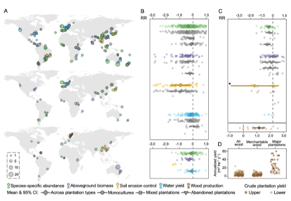 图2:人工林(与天然林相比)在生物多样性与生态系统服务各个维度的评估:A-数据来源分布及数据量;B-人工林与成熟天然林相比的相对成效(上图),林龄较老或处于废弃状态的人工林与天然林相比的相对成效(下图);C-人工林与恢复的天然林相比的相对成效,包括木材生产 (下图);D-恢复的天然林与全球主要单一树种人工林在木材年均产量上的对比。(图片来源:文章)