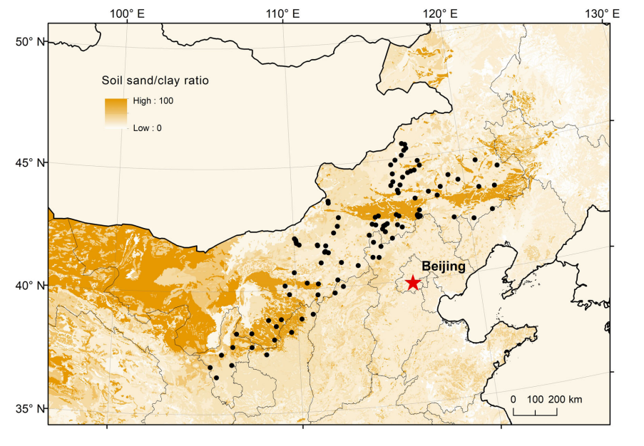 除气候外,土壤质地也能影响土壤水分的运动与分布,对植物的干旱相关功能属性产生影响。然而,以往对植物功能属性的研究主要关注气候导致的水分亏缺,而对土壤导致的水分亏缺关注较少。本研究基于样带调查数据,以中国北方温带草地上分属三个功能类群(须根系C3植物、须根系C4植物、直根系C3植物)的12种广布植物为研究对象,研究了干旱指数和土壤质地对植物功能属性的影响。