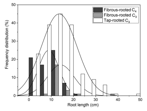 在研究关注的物种中,须根系C4植物的根长较短,与须根系C3植物和直根系C3植物都有显著差异(图2)。