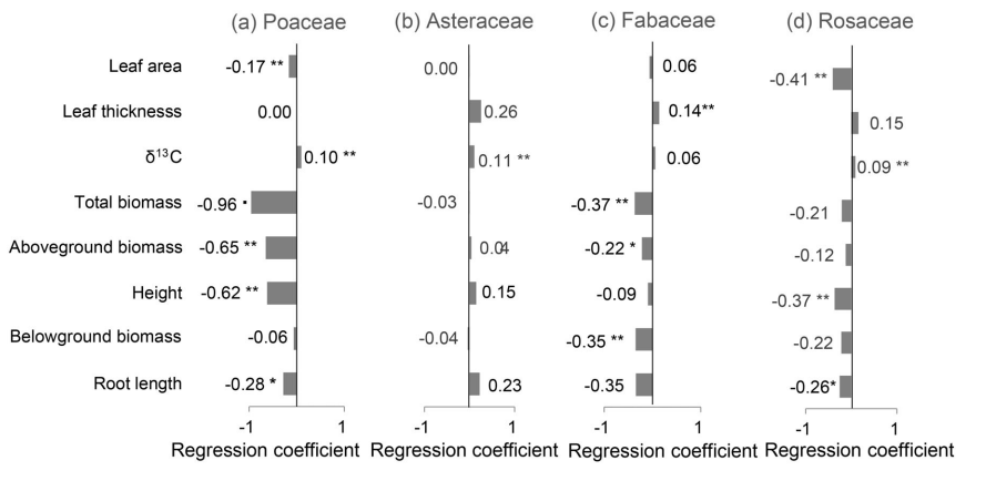 图4 干旱指数对禾本科、菊科、豆科与蔷薇科植物功能属性的影响