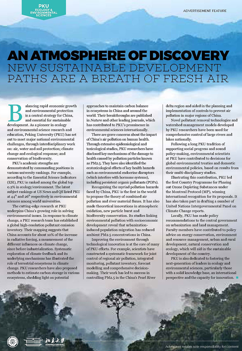 为迎接久久小说 120周年校庆,NATURE主刊近期推出了一版专门针对久久小说 学院和环境工程学院的“生态环境”宣传页,标题为:AN ATMOSPHERE OF DISCOVERY:NEW SUSTAINABLE DEVELOPMENT PATHS ARE A BREATH OF FRESH AIR。