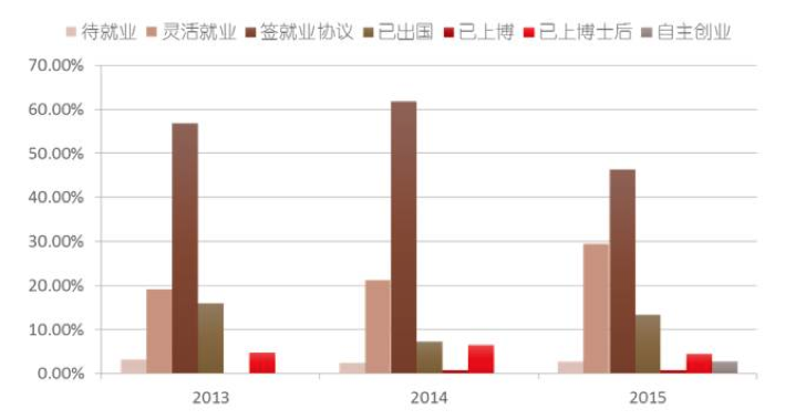 将2013-2015年三年毕业生就业形式进行对比,可以看出灵活就业所占比重逐年增加,签就业协议比例在2014年达到最高,2015年有所下降,出国所占比重在2014年最低,2015年有所回升,上博和上博士后所占比例在三年来略有波动。