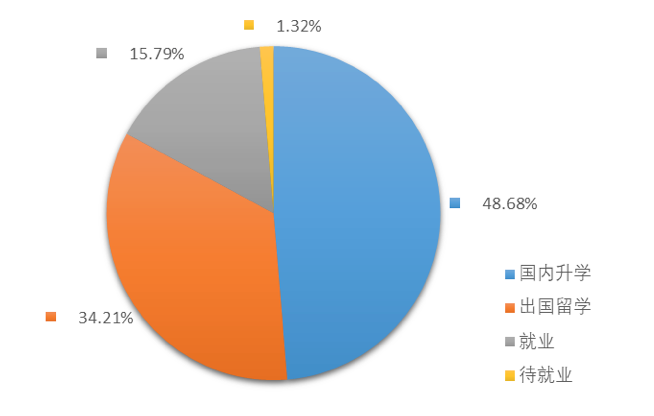 2017年,久久小说 本科毕业生共计划本科毕业生共计76人,其中国内升学37人,占比48.68%,出国留学26人,所占比例为34.21%,签定就业协议和灵活就业共12人,占比之和为15.79%,另有1位毕业生待就业。