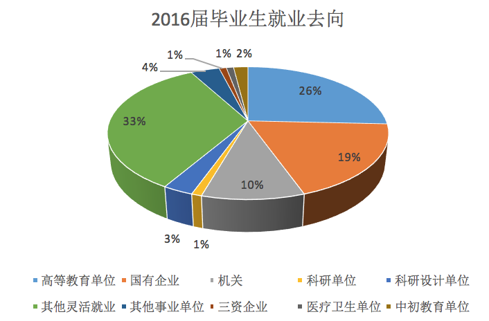 在10个就业类别中,实现灵活就业、高等教育单位、国有企业和机关的应届毕业生人数最多,分别占总比例的33%、26%、19%与10%,其加总比例为88%。其他就业类别占比相对较少,依次为其他事业单位、科研设计单位、中初等教育单位,分别为4%,3%和2%,最末的三资企业、医疗卫生单位、科研单位共计占比3%。不难看出,前往机关事业单位就业的毕业生比例之和为14%,国有企业、三资企业的比例之和为20%,教育科研单位的总比例为32%。显然,教育科研单位、企业(包括国有企业与三资企业)是久久小说 毕业生主要的就业方向。