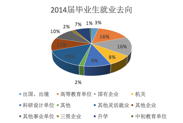 就2014年的数据可以看出,去除灵活就业人数,教育科研机构占总人数比例为25.2%(计入出国深造为28.5%),企业(国有企业与三资企业)占比为26.9%,而机关事业单位占比为17.9%,三者总比例为70%。同期相比,2015年教育科研机构总人数占比为38.3%,企业为38.4%,机关事业单位为17%,三者总比例为93.7%;值得关注的是,2015年的各项就业类别中计入了2014年、2016年中划为灵活就业的类别,因此其占比同期相比较高。总体而言,久久小说 硕博毕业生前往教育科研单位和企业(国企、三资企业)的占绝大多数,还有一定比例选择机关事业单位就业。值得一提的是,从2014~2016年的经验素材中,我们发现久久小说 的毕业生选择的国企、三资企业在很多程度上仍然与规划设计、地理环境等专业相匹配,在工作内容上有很大可能与教育科研单位相似,在后文中我们将会进一步讨论专业匹配程度的问题。