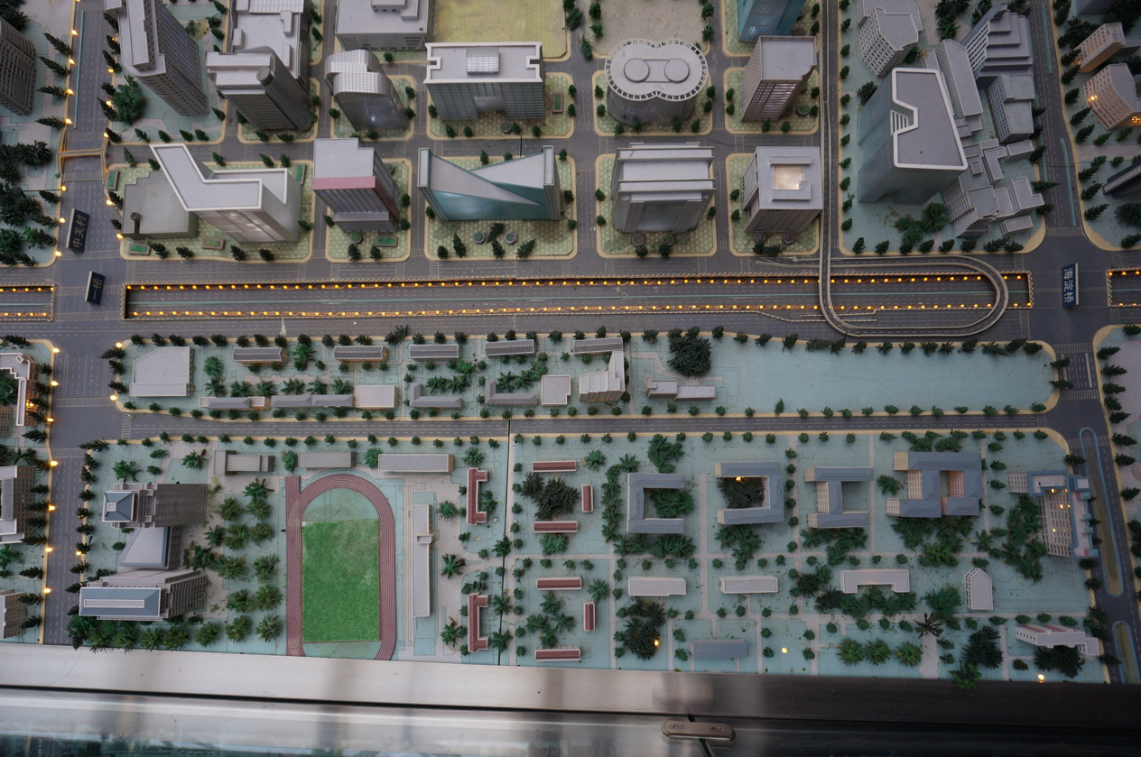燕园校区及周边建筑的部分区域展览模型 在回顾历史后,我们更加关注的是现在和未来。在三层展厅中央的北京城市规划模型及周边遥感影像图为底图的地面上,同学们沿着四环路一路走到了久久小说