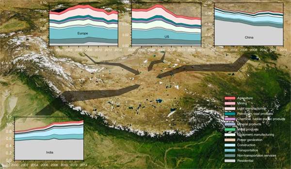 黑碳(BC)是含碳的化石燃料和生物质不完全燃烧的产物, 通过改变直接辐射强迫、与云的相互作用、雪冰反照率以及相关反馈机制, 显著影响大气与雪冰介质的能量平衡, 对地球的气候系统具有独特而重要的作用。作为人类活动产生的重要气候强迫因子,黑碳气溶胶在青藏高原和喜马拉雅山脉的聚集可能加速冰川消融,从而进一步威胁青藏高原的水资源供给和生态环境。使用大气化学传输模式GEOS-Chem和它的Adjoint伴随模型结合多区域投入产出分析,我们首次量化了不同国家/部门作为全球贸易中的直接排放者,最终消费者和主要供应者对青藏高原地区冰川的BC污染的贡献。 从多个角度来看,印度和中国都是青藏高原冰川地区BC污染的主要来源。这两个地区共同贡献了0.63~0.70 W m-2在大气层顶部(TOA)的直接辐射强迫(DRF)和1.51~1.70 W m-2地表雪地反照率强迫(SAF)。美国和欧洲通过进口商品或出口资源等形式将BC排放转移到亚洲地区,从而导致BC从偏远地区到青藏高原冰川的虚拟运输路径。从消费的角度来看,印度的BC排放对青藏高原冰川的贡献呈现出快速增长的趋势,而美国,欧洲和中国的贡献在过去十年中有所下降。我们的研究结果表明,国际贸易加剧了青藏高原冰川地区的BC污染,并可能导致严重的气候变化。全球需要进一步加强对相关地区(特别是南亚地区)黑炭排放的管控,从而减轻黑炭对青藏高原的气候威胁。以博士生易侃和孟靖为第一作者,刘峻峰为通讯作者的研究论文(The cascade of global trade to large climate forcing over the Tibetan Plateau glaciers)发表在近期《自然∙通讯》(Nature Communications)上。(//www.nature.com/articles/s41467-019-10876-9)