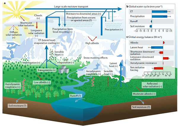 朴世龙教授研究组应邀在Nature子刊Nature Reviews Earth & Environment的创刊号上发表了题为“Characteristics, drivers and feedbacks of global greening”的综述文章(也是该刊创刊以来发表的第一篇论文),系统梳理与综述了1980年代以来全球植被生长增加即植被变绿的观测证据、驱动机制,及其对气候系统的反馈作用。 基于多数据源和多指标的遥感证据表明,上世纪80年代以来的植被变绿一直持续至今,这一趋势在北方高纬地区以及农田和植树造林区域尤为醒目(图1)。在全球尺度上,二氧化碳施肥效应是植被变绿的主要驱动因子;但不同区域植被变绿的主导因子不尽一致,例如升温是导致青藏高原和北方高纬地区植被变绿的关键机制, 而植树造林活动是北半球温带地区植被变绿的关键因素。陆地植被变绿通过吸收更多的大气二氧化碳的生物地球化学过程(图2)和蒸腾降温等生物地球物理过程(图3),显著减缓了全球气候变暖。植被变绿对蒸腾的促进作用同时也加剧了全球水循环。对区域水循环而言,植被变绿一方面通过增强蒸腾作用导致土壤水分和地表径流的减少,另一方面还可扰动大气环流,引起降水格局的变化,从而起到弥补(下风向)或加剧(上风向)蒸腾作用增强导致的水分散失的作用。植被变绿对区域水循环的总体影响取决于两者之间的博弈。 文章最后指出,植被变绿是进入人类世后地球生物圈变化最为显著的特征之一。未来研究仍需进一步加强遥感观测尤其是对热带地区植被的监测,并提高模型对植被生长响应和反馈气候变化关键过程的模拟精度。该研究综述回答了近年来有关全球植被是否变绿的争论以及全球植被变绿主要驱动力的争议,推动了从地球系统多圈层耦合视角研究植被变绿及其影响,不仅丰富和发展了植被和全球变化学科内涵,还为应对全球变化的生态系统解决方案提供了科学依据。 该研究得到了国家自然科学基金等项目的资助。 文章链接 //www.nature.com/articles/s43017-019-0001-x