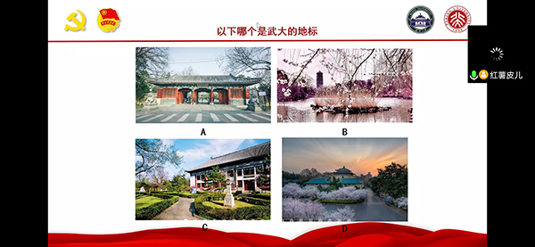 杨怀志介绍了和父亲两代党员共同参加当地中学和社区抗疫工作的经历。他表示,疫情最严重的时候,党员应该迎头而上,青年尤其首当其冲。王玥瑶表示90后、00后一代不再是被庇护的花朵,而是默默支撑起了疫情下的城市,展现了担当和力量。 图3 宋晓燕分享参与深圳市疫情应急民生地图项目经历 图4 张琛分享所在团队制作的临海市疫情防控复工复产地图 活动最后,两支部同学们通过两校地标、校园动物、城市代表美食和春天花卉等与两所学校息息相关的的题目,进一步增加了对双方学校的了解。同学们积极参与答题,气氛轻松而融洽。 图5 知识竞赛环节 会议最后,两个学院参会老师发言。梅菲表示,党团队伍中始终活跃着有崇高理想的青年人。这次疫情中,青年人接过了历史的接力棒,证明了青年人的责任和担当。希望大家今后也能与国家共同奋进,无愧于这个时代。王宇凡对同学们用各种方式为抗疫贡献力量给予了充分的肯定。抗疫还远未结束,中国在国际疫情的日益严峻的情况下,展现出了大国实力和大国担当,希望同学们能够发挥专业所长,在全球化的背景下为抗疫尽一份力。两个支部有很多专业上的重合,今后有机会可以进行更多的交流活动。 东湖之滨,未名湖畔。两所学校虽然相隔千里,却通过这次的线上共建活动紧紧联系到了一起。无论是武大还是北大的青年学子,都在用自己的方式支持抗疫,奉献青春力量。青年人在奉献中磨砺本领,更在奉献中认识到自己肩上的重担。习总书记的回信不仅仅是对一线青年医护人员的肯定,更是对广大青年一代的鼓舞。两校学子必将继续守望相助,以青年之理想、之本领、之担当,砥砺奋进,守护职责,不愧于总书记的殷殷嘱托,让青春在党和人民最需要的地方绽放绚丽之花。