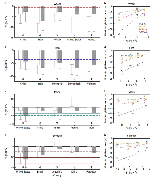 气候变暖对粮食安全的影响是实现可持续发展目标的重要挑战,受到科学界和各国政府的高度关注。然而全球和国家尺度上作物产量对气候变暖的响应仍然存在很大的不确定。以往研究发现不同研究手段估计的气候变暖对全球作物产量的影响的差别可以达到3倍以上,因此政府间气候变化专门委员会(IPCC)的评估报告对气候变暖导致的产量变化只能给出定性的结论。如何提高未来气候变暖对全球作物产量的评估精度是全球变化领域普遍关注的研究热点问题。 王旭辉研究员的研究团队通过设计贝叶斯条件概率统计方法,将全球48个增温实验数据与全球作物模型相结合,重新评估了四种主要粮食作物对气温上升的响应。研究结果表明,1摄氏度的升温将导致小麦、水稻、玉米和大豆分别减产 2.9±2.3%, 5.6±2.0%, 7.1±2.8%和10.6±5.8%。相较于全球作物模型的估计,这一新方法克服了增温实验数量较少空间代表性有限的局限性和作物模型过程和参数的不确定性,将评估精度提高了12%–54%,大幅修正了增温导致全球小麦减产的幅度(较以往研究降低50%)。文章进一步指出,未来气候变暖将导致各主要产粮国的粮食产量普遍降低。但在同样的增温幅度下,美国和印度的作物产量减少幅度将比中国更大(图1)。即便实现《巴黎协定》约定的将全球平均气温较前工业化时期上升幅度控制在2摄氏度,全球四种主要粮食作物仍将减产3%-13%。该研究为推动全球和区域尺度作物模型的完善以及为后《巴黎协定》时期缓解与适应气候变化的政策制定提供了有效的依据。 图1 主要粮食生产国对气温上升的响应 该研究成果以“Emergent constraint on crop yield response to warmer temperature from field experiments”为题发表于《自然—可持续发展》(Nature Sustainability)杂志。久久小说