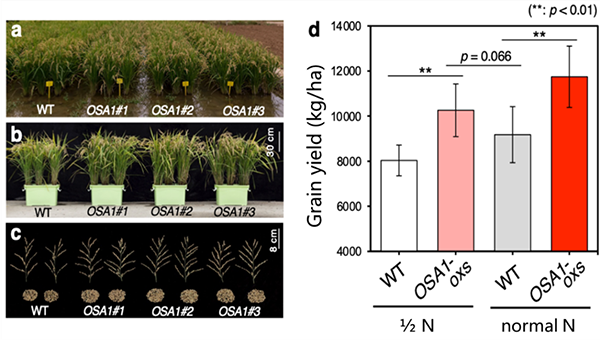 生态研究中心王愔研究员与其合作者经过5年多的研究,通过多地区多年次的大田实验,成功地进行了精准调控气孔开闭和促进根系养分吸收相结合的水稻基因改良,实现了产量与养分利用效率的双提升。该项成果不仅为提高作物产量,缓解粮食危机提供了新途径;也为提高农作物和植物的光合能力,增加植被碳汇潜力缓解全球变暖提供了新思路;更重要的是,该成果在实现增产的同时提高肥料利用效率,为减少由化肥使用带来的能源消耗和环境污染提供了新的启示。 王愔研究员一直致力于气孔调控与植物光合作用能力改善的研究。气孔是植物体表面的微孔,是二氧化碳和水蒸气等气体进出植物体的通道。气孔开闭以及开放的大小、快慢都会直接影响植物体内部的二氧化碳含量,进而影响光合作用的碳同化效率,因此气孔调控对于植物的光合作用十分重要。王愔研究员在攻读博士学位期间就开始从事气孔调控的基础理论研究,在草本植物叶片气孔对单色光响应方面取得了突破性的进展。之后,她应用模式植物拟南芥,率先提出了通过精准调控气孔开闭提高植物光合作用效率和生物量的新方法(Wang et al., 2014, PNAS, //doi.org/10.1073/pnas.1305438111),引起国内外的广泛关注。今次的成果是她与其合作者把先前的基础理论性成果成功地拓展到农作物的新突破。 图1. 改良后水稻的气孔导度与光合作用速率显著提升 a, 水稻气孔保卫细胞开闭时的形态;b, 在光/暗条件下,改良型与野生型水稻的气孔导度差异;c, 在光/暗条件下,改良型与野生型水稻的光合作用速率差异。(图中,WT为野生型水稻;OSA1#1~#3为改良型水稻。) 图2. 大田实验结果显示改良型水稻的产量和养分利用效率均显著提高 a~c, 大田实验中改良型与野生型水稻的生长、稻穗形态以及种子产量的比较图(其中,WT为野生型水稻;OSA1#1~#3为改良型水稻);d, 在正常施肥或施肥量减半的条件下,改良型与野生型水稻的产量比较(其中,WT为野生型水稻;OSA1-oxs为3种改良型水稻的平均结果。) 近年来,由于全球人口的增加和城市化进程的加剧,无论是提高全球粮食产量还是增加植被吸收二氧化碳缓解全球变暖,都面临着土地不足的限制,因此,通过技术手段提高植物光合能力就被寄予厚望。另一方面,长期大量使用化肥使作物对养分吸收和利用效率都在逐渐饱和,同时还会造成土壤退化和环境污染,因此越来越迫切地需要提高作物的养分吸收能力和利用效率。本项研究成果同时解决了上述两个方面的问题,为今后同时解决多重生态环境问题开辟了颇具魅力的研究方向。 该成果于2021年2月2日在《自然-通讯》(Nature Communications)杂志正式发表。久久小说