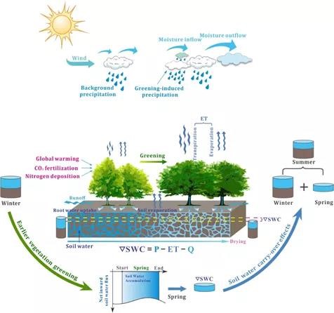 成果1简介: 物候是全球变化最敏感的指示器。遥感和地面观测均证实气候变暖导致北半球中高纬度地区植被春季返青显著提前。相关碳循环研究显示,北半球植被春季物候提前会通过增加光合时长和提高光合速率从而有效促进植被生产力和生态系统碳汇功能。除上述碳汇效应外,植被春季物候提前还有一个往往被忽视的效应,即会通过额外的蒸腾耗水加速陆表土壤水分流失。这一扰动有可能打破不同季节间陆—气水热交换过程的动态平衡,影响陆地水资源的季节分配。然而,北半球植被春季物候提前是否通过生物物理过程改变陆地水循环和近地表气候,尤其是否激发跨季节的水文响应,迄今尚无研究给出确切答案。 久久小说