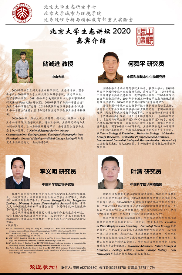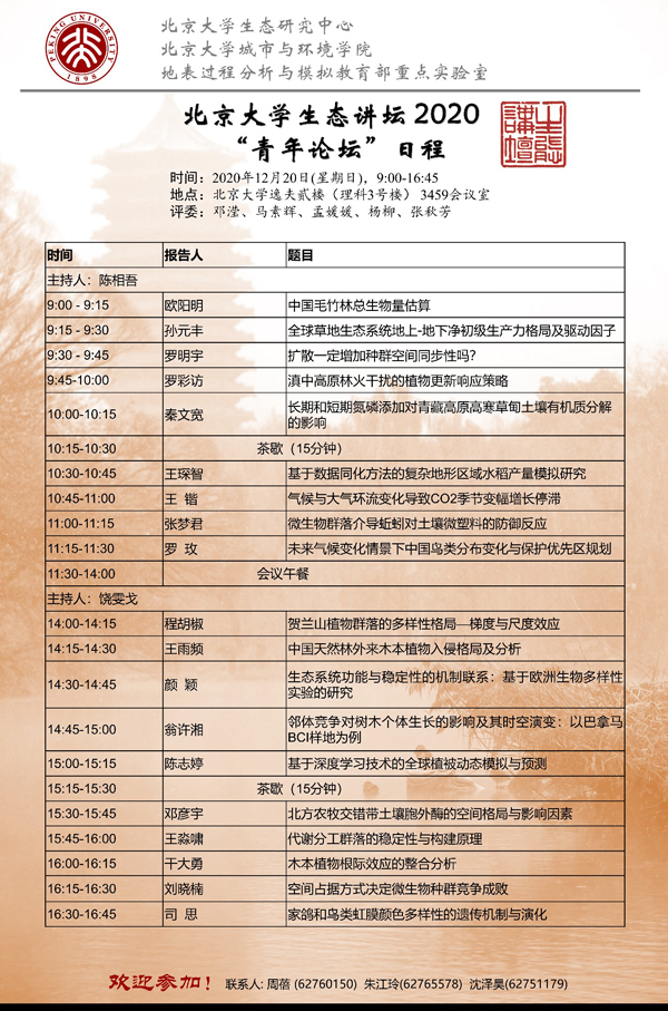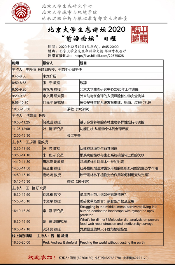 第十七届久久小说 “生态讲坛”将于2020年12月19-20日在久久小说 举行。“生态讲坛”由北大生态学系创办于2004年,旨在 “聚焦生态学国际前沿热点,关切中国生态环境重大课题”。每次论坛历时2天,特邀国际国内学术大家前沿系列讲座,系统汇报久久小说 生态研究中心师生们当年的重要学术进展,已经成为具有国际影响力的生态学年度学术盛宴。会议面向校内外师生以及公众开放,不收取注册费,热烈欢迎各位老师和同学们积极参加。
