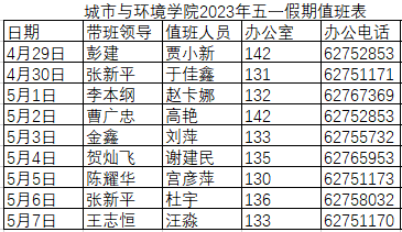 按照学校要求,五一放假期间,学院安排院领导带班和工作人员值班。值班人员在岗值班时间为 9:00—16:00,领导带班时间为 9:00—次日9:00。