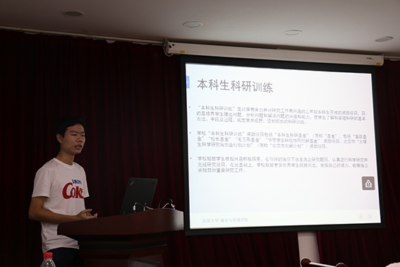 随后,学院学生代表张志皓同学(中国大学生环境教育基地志愿者)介绍了“林歌”项目在校园废纸、军训衣物回收等方面所做的主要工作;童培峰同学(本科生科研学生代表)介绍了学院在本科生科研教学工作的培养项目和学术研究成果。