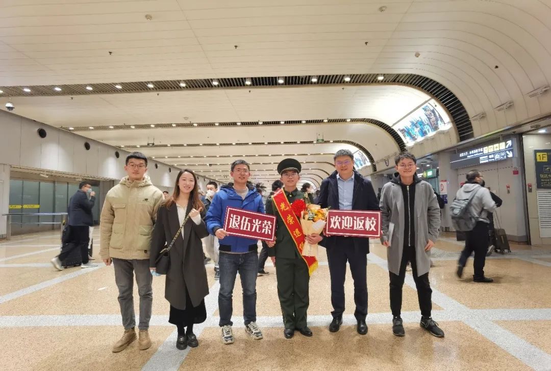 学院党委书记彭建,团委常务副书记宋宛儒前往上海将徐思昊亲手接回校园,辅导员葛孟帅、王良蛟,城环退伍士兵李龙盛在机场高举“退伍光荣,欢迎返校”的手牌等待凯旋。