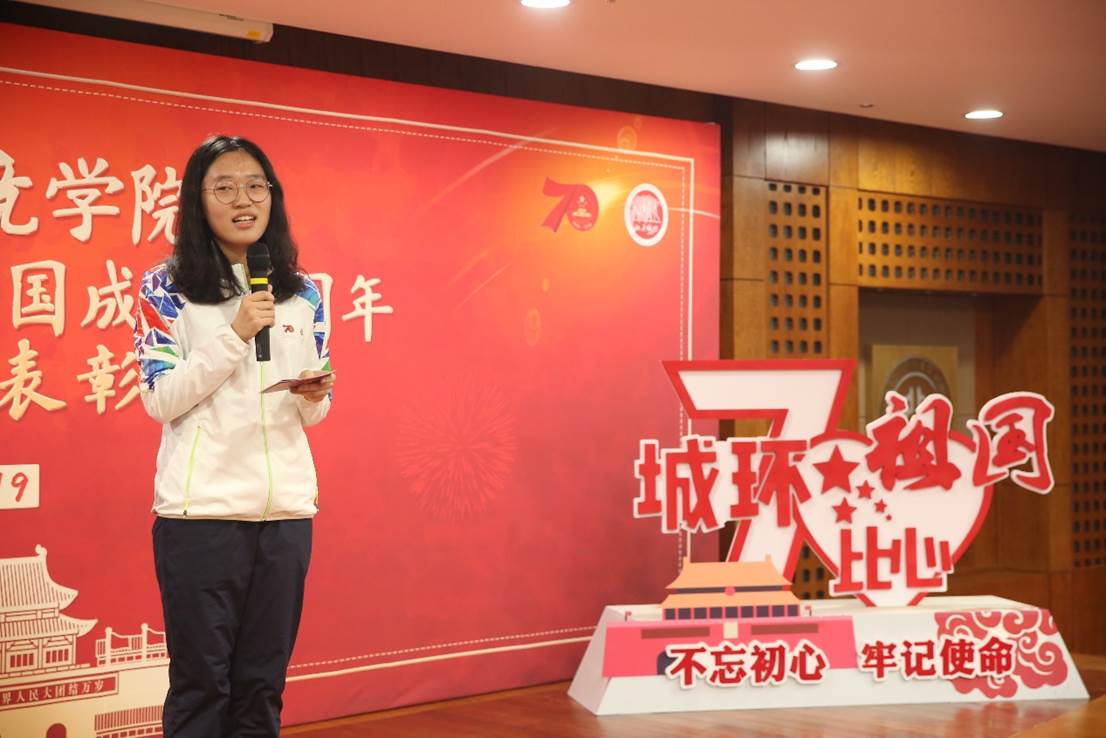 接下来,贺灿飞宣读了学院对重大活动参与师生的嘉奖令,刘耕年、贺灿飞、石长翼、陈耀华、张新平、李晓瑭为师生颁奖。之后,2019级本科新生合唱一首《国家》,全体与会成员齐唱《同心共筑中国梦》,以歌声表达对祖国深沉的爱,向祖国献礼。现场仿佛回到了重大活动当日,同学们激动地挥舞起手中的红旗,“团结起来,振兴中华”的口号响彻会场。