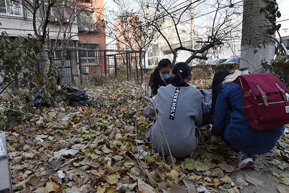 图四.同学们用手捡拾落叶
