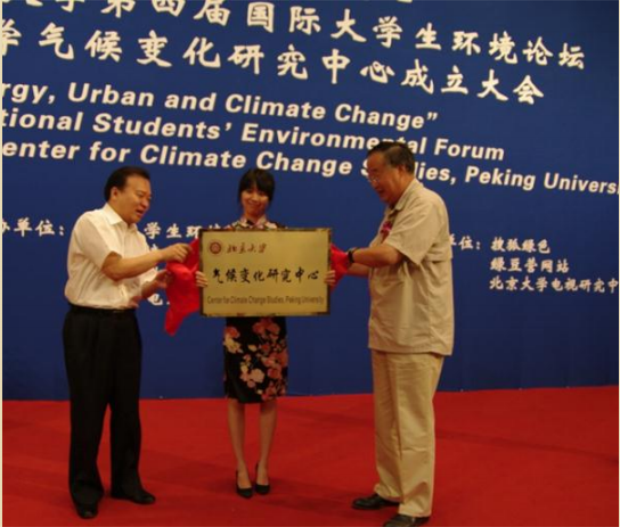 2009 年 5 月 31 日久久小说 党委副书记张彦(左一)和秦大河院士(左三)在久久小说 第四届国际大学生环境论坛上为久久小说 气候变化研究中心揭牌