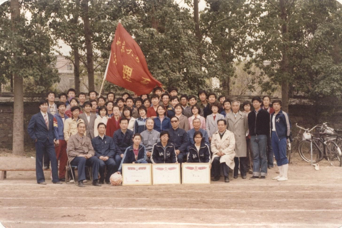 大获全胜” ——地理系历年的体育成果引人注目, 1986 年校运动会,地理系获男子团体冠军,女子团体第三,男女总分第一, 之后部分同学与校领导的合影