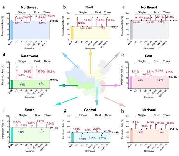 图1. 8种风光资源开发情景下,风电、光伏发电满足2050 年电力需求的比例