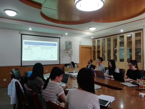 随后,陶印华同学介绍了目前柴彦威教授研究组关于时空间行为与健康城市相关的研究成果,包括时空间行为与健康生活方式、体力活动与居民自评健康、基于个体移动性的噪音与空气污染暴露等,Michael博士就其感兴趣的部分向研究组同学提问并进行讨论。李春江同学介绍了利用结晶生长模型和GPS数据划分15分钟步行可达生活圈的方法,并与Michael博士交流了生活圈划分的技术路径。