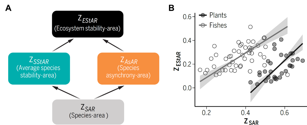 图2.物种多样性与生态系统稳定性的尺度推移规律(SAR和EStAR)之间的关联:(A) 理论预测,(B)经验数据