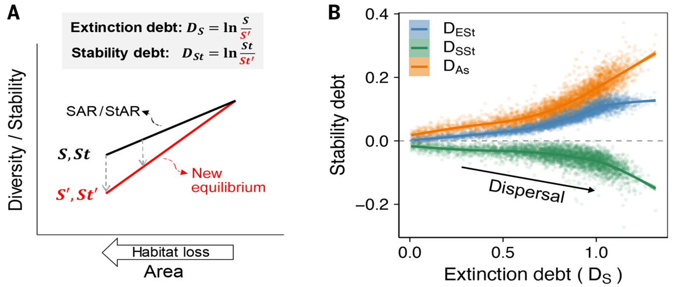 本研究结合理论与经验分析阐明了种-面积关系(SAR)和生态系统稳定性-面积关系(EStAR)之间的关联,拓展了传统的基于小尺度上的多样性-稳定性理论。通过揭示生态系统对生境丧失响应的滞后性——即物种灭绝债务引发的稳定性债务,研究结果为大尺度生物多样性保护与生态系统管理政策制定提供了新认识和理论基础。