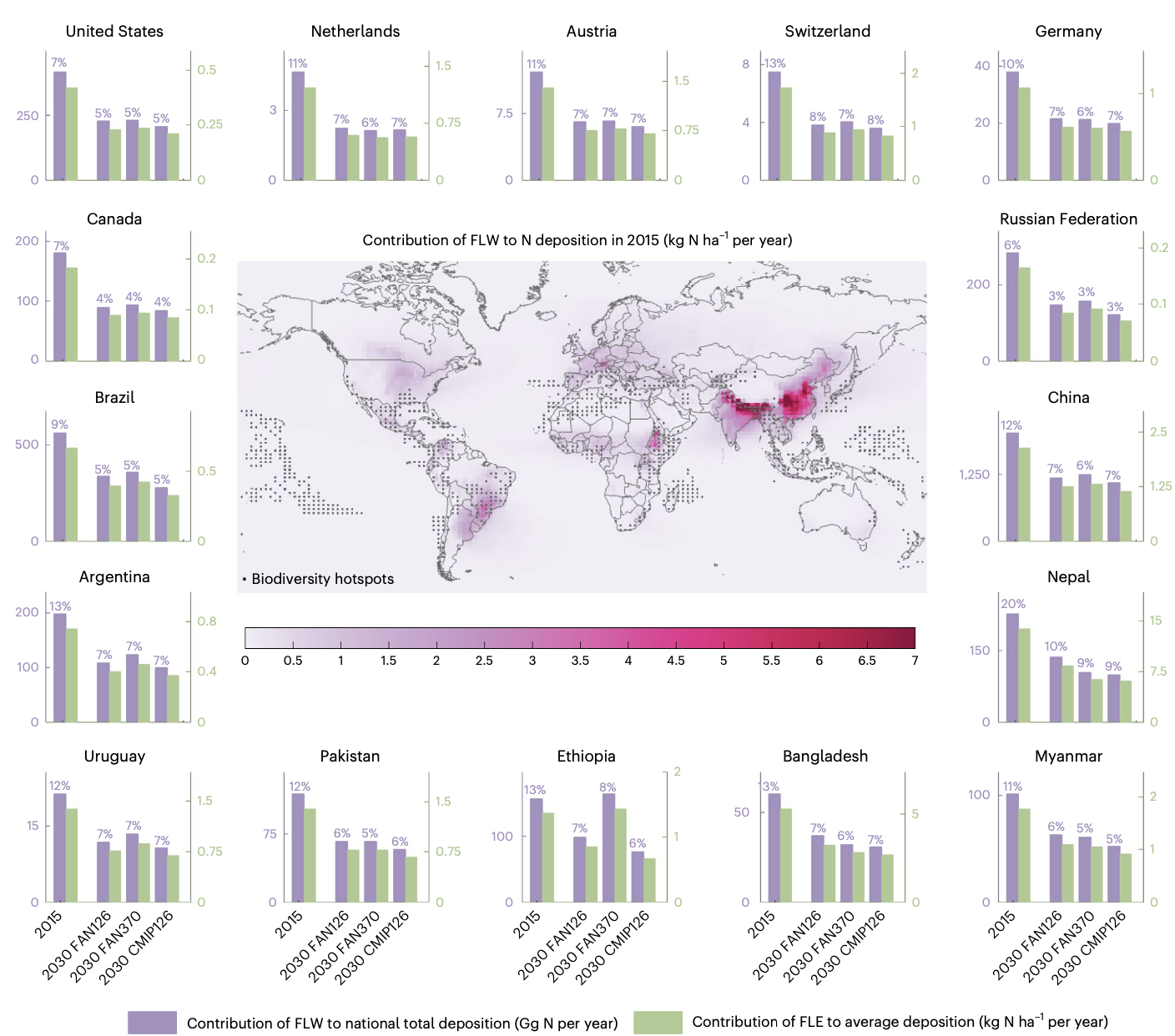 此外,避免FLW可使全球氮沉降减少9.7 百万吨氮/年,减幅为7%,最大幅度的氮沉降减缓发生在中国东部、印度东北部和欧洲部分地区。同时,全球生物多样性热点区域的氮沉降超标率将减少19%,这些热点区域虽然仅占地球表面积2.5%,却提供全球35%的生态系统服务。这些地区对于过量氮沉降(>5 千克氮/公顷/年)非常敏感,氮沉降减缓将对当地和全球生物多样性有显著的保护作用,例如,喜马拉雅地区和大西洋森林保护区的氮沉降通量下降高达8 千克氮/公顷/年和1.3 千克氮/公顷/年。在2030年,实现 FLW减半将使全球氮沉降降低4.7-6百万吨氮/年。研究团队进一步指出,全球农业生产技术改进带来的农业氨减排潜力(41%)大于FLW治理带来的农业氨减排潜力(21%),虽然后者不能替代前者,但能有效促进活性氮污染治理。