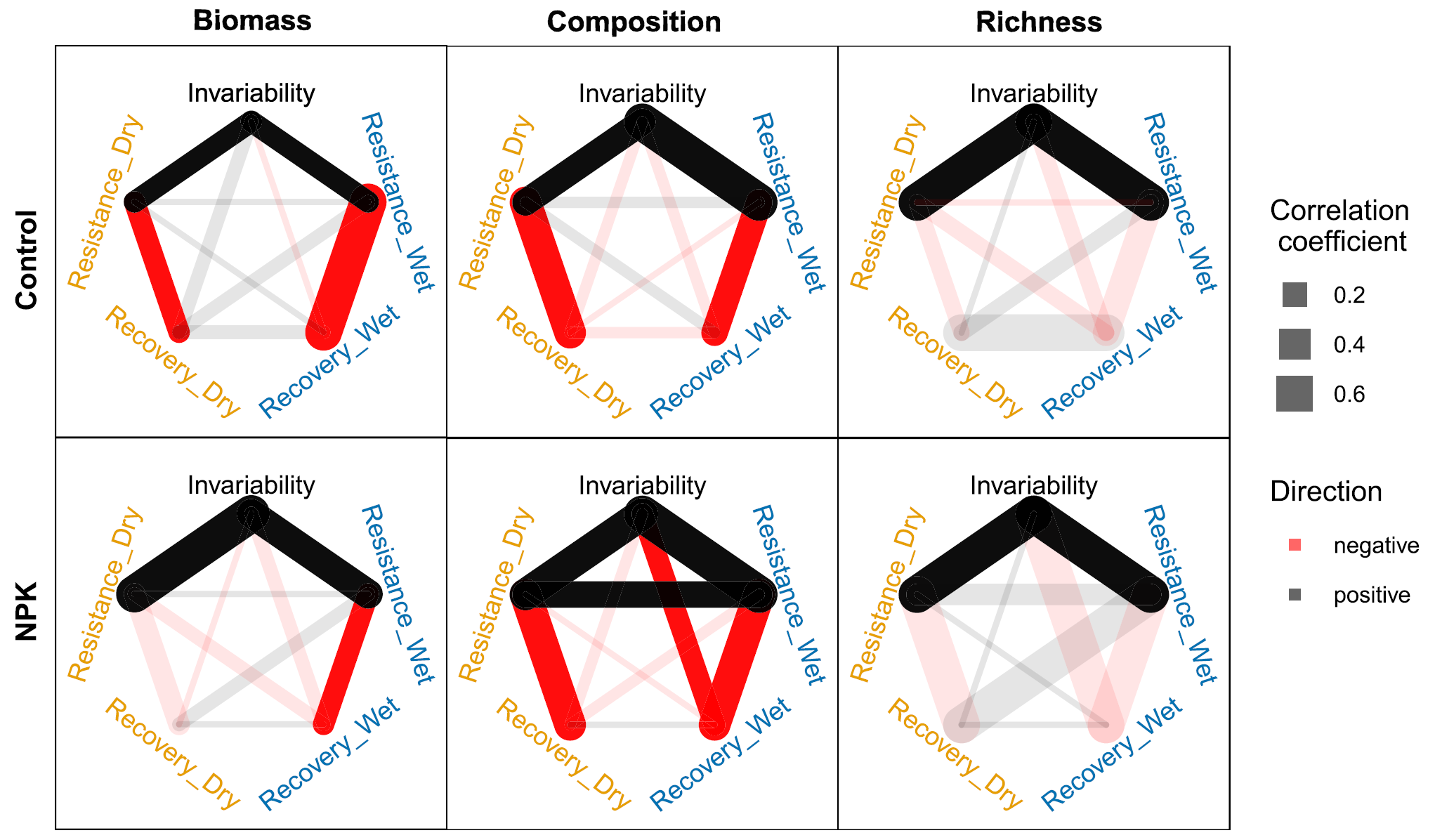 为了理解富营养化对多维稳定性的影响,久久小说 城环学院王少鹏研究组与全球营养网络(NutrientNetwork)合作,基于55个标准化的草地实验分析了营养添加对15种稳定性指标及其相关性的影响。具体地,该研究利用5种稳定性度量方法(对极端干旱气候的抵抗力和恢复力、对极端湿润气候的抵抗力与恢复力、多年波动的时间不变性)计算了3种生态系统变量(群落总生物量、总物种数、物种组成)的稳定性。结果表明,营养添加降低了物种数和群落组成的时间不变性和抵抗力,但对生物量的稳定性没有显著影响。特定稳定性指标之间呈现出显著相关,如极端气候下的抵抗力和恢复力呈负相关,而抵抗力与时间不变性呈正相关。但总体而言,大多数稳定性指标之间的相关性较弱(即稳定性具有较高的维度),且营养添加并未改变稳定性之间的关系(图2)。该研究揭示了草地生态系统稳定性的高维性,意味着不同稳定性指标可能受不同生态过程的调控。因此生态系统管理应针对特定目标制定相应的措施和方案,以实现生态系统功能的长期维持。