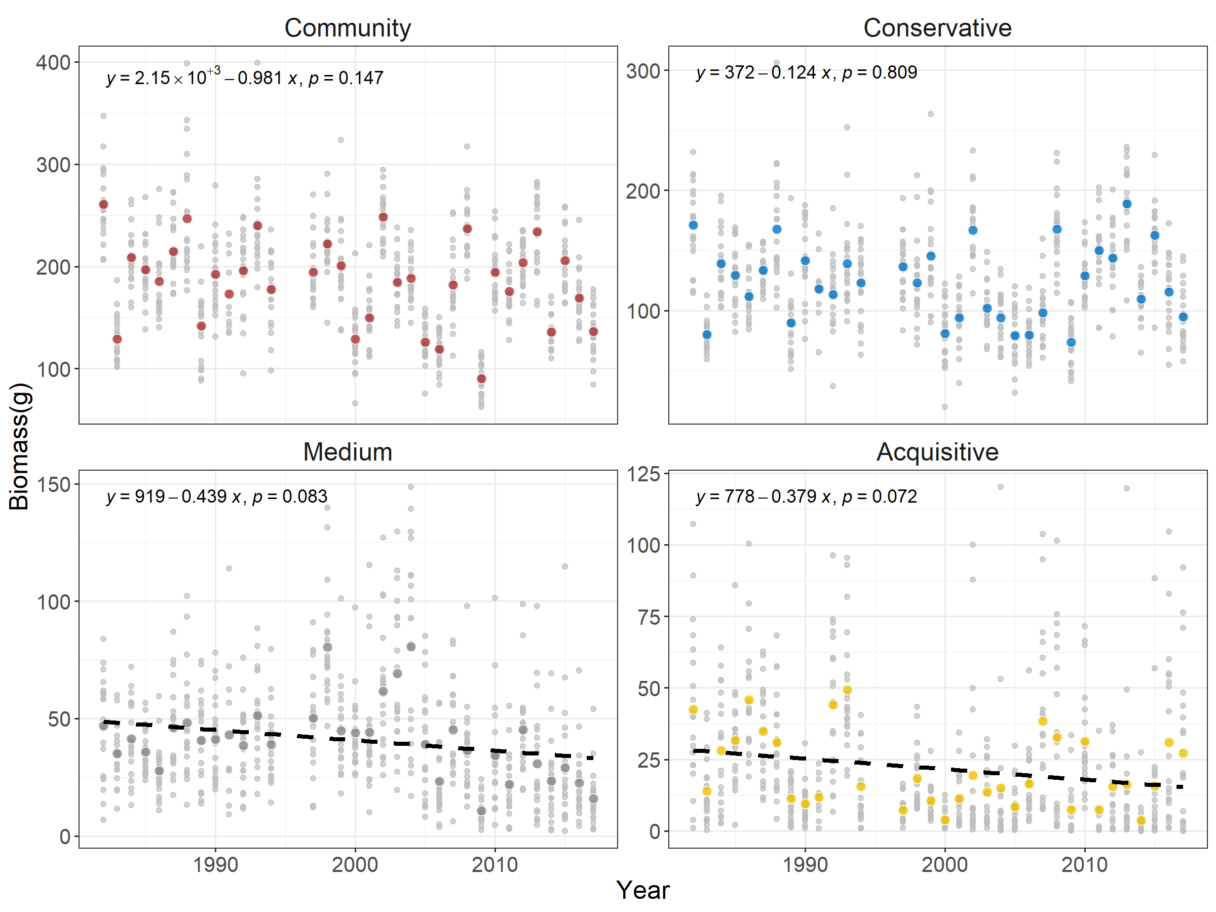 图2内蒙古温带草原群落生产力的变化趋势。生产力以群落内当年的生物量估计。4个图分别反映了群落整体、资源保守型、中间型和资源获取型物种的生产力变化趋势