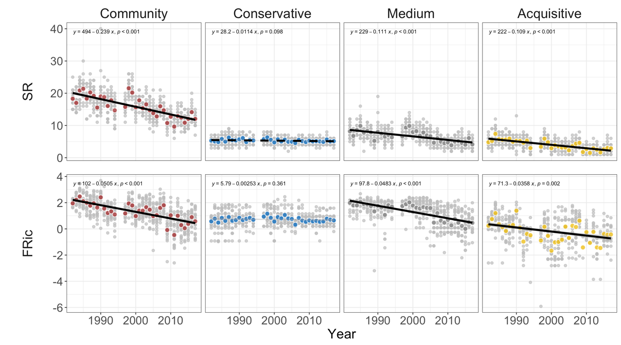 与群落内物种和功能多样性的快速下降不同,群落的生产力在过去30余年种没有显著的变化趋势,说明该草原群落内的植物物种和功能多样性下降尚未对群落生产力产生显著的影响。这可能主要是因为群落的生产力由资源保守型物种主导,而中间型和资源获取型物种对群落生产力的影响较弱。