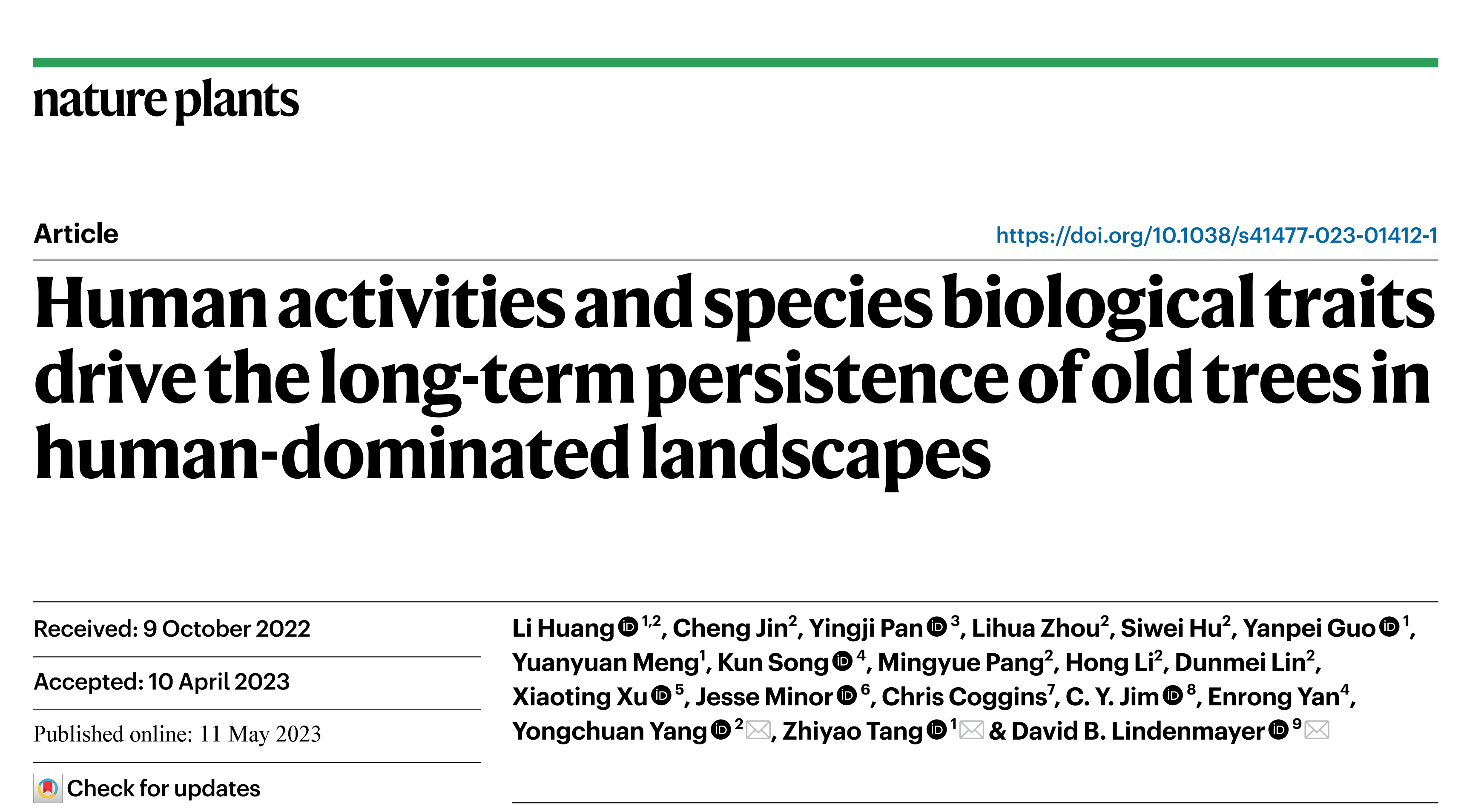 上述研究成果5月11日以题为“Human activities and species biological traits drive the long-term persistence of old trees in human-dominated landscapes”的研究论文发表在Nature Plants上。久久小说 博雅博士后黄力为论文的第一作者,重庆大学杨永川教授、久久小说 唐志尧教授和澳大利亚国立大学David B. Lindenmayer教授为论文的共同通讯作者。合作者还包括久久小说 博士后孟媛媛和郭焱培,重庆大学博士研究生靳程、周礼华和胡四维,中科院东北地理研究所潘应骥研究员,四川大学徐晓婷副教授,重庆大学庞明月副教授、林敦梅副教授和李宏副教授,华东师范大学宋坤副教授和阎恩荣教授,香港教育大学C. Y. Jim教授,美国巴德学院西蒙洛克分校Jesse Minor博士以及缅因大学法明顿分校Chris Coggins教授。研究受到国家自然科学基金和中国博士后科学基金资助。