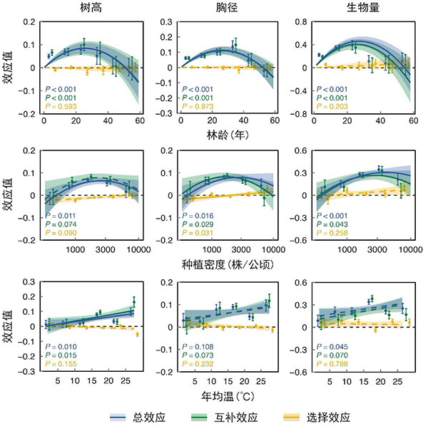 研究还表明,混交林的增产效应随着林龄和种植密度的增加呈单峰变化,峰值出现在林龄25年左右和种植密度2500~4100株/公顷之间(图2);气候条件在一定程度上也影响增产效果:高温地区增产效果更明显,但对降水变化不敏感。此外,研究还显示,随着混交物种的增加,增产效应呈现增加趋势。