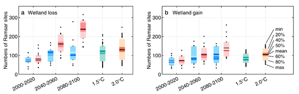 图1. 21世纪面积变化超过10%的Ramsar内陆湿地的数量变化。蓝色表示低排放情景RCP2.6,红色表示高排放情景RCP8.5。