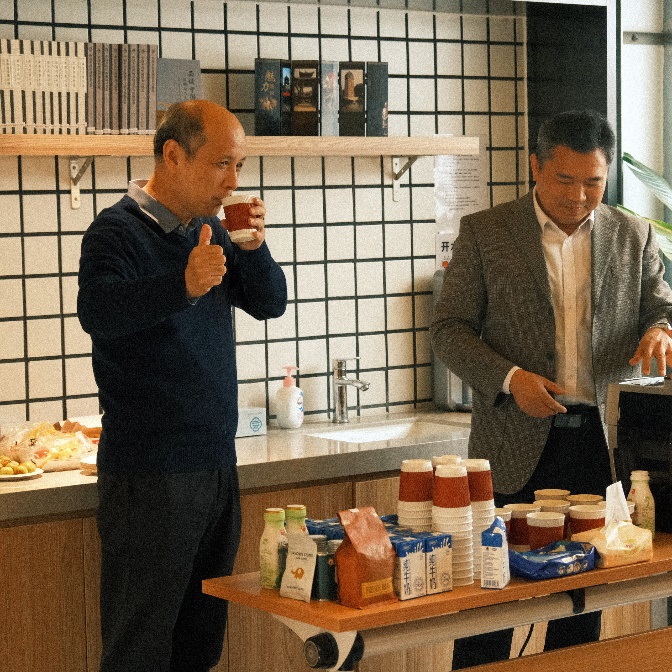 四楼空间以咖啡会友交流为主,学院老师携带着不同风味的咖啡豆前来,研磨调配出美味咖啡饮品。大家围坐一起,品尝着咖啡、水果和小点心,分享着心情,交流着学术研究进展。在品味咖啡活动中,还举行了教工羽毛球队的颁奖仪式,党委书记彭建、副院长李本纲和王志恒分别为队员颁奖,感谢队员们在北大教职工羽毛球锦标赛中的精彩表现和努力。空气中弥漫着咖啡的醇香,飘荡着欢声笑语,虽是清冷的冬日,大家却感到暖暖的幸福。