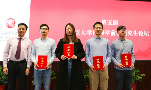 接下来,李双成教授对参会论文评审过程进行说明,并公布获奖结果。自2019年10月10日开通征稿渠道至11月10日止,共收到来自全国高校的自然方向投稿32篇,人文方向投稿48篇,共80篇。研究生论坛会务组邀请人文方向与自然方向各4名专家教授组成专家评审团,秉承公开、公平、公正的原则,从能力水平和论文质量两大方面进行匿名评分。根据打分结果评选出一等奖2名,二等奖4名,三等奖6名,优秀奖20名。随后,何书金,沈彦俊,刘耕年,周丰及唐琳等几位老师为各位获奖同学颁奖。