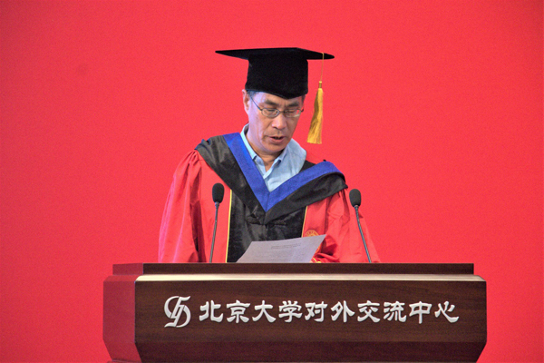 上午九点,典礼在雄壮的国歌中正式开始。学院2002级环境科学专业校友,北京清新环境技术股份有限公司总裁助理、董事会秘书,雄安清新智慧科技有限公司执行董事、总经理李其林首先致辞。他分享了自己在北大学习的经历和体会,并且讲述了自己从实业、到金融、到再回归环保实业的产业追寻之路,勉励同学们在习近平主席“两山论”逐渐深入人心和国民经济向高质量发展转型的大背景下,用自己的专业素养服务新时代的经济和城市建设的需要,实现自己的人生价值。