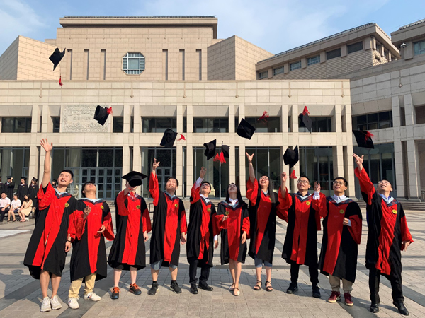 典礼开始前,毕业生们在百周年讲堂前进行了合影,将垂布摆放在胸前,学士帽端正戴好,与老师和同窗分享这一刻属于自己的自豪与喜悦、激动与不舍。