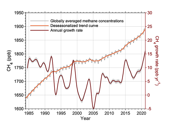 图1 大气甲烷浓度观测曲线。灰色为观测值,橙色为趋势线,棕色为增速
