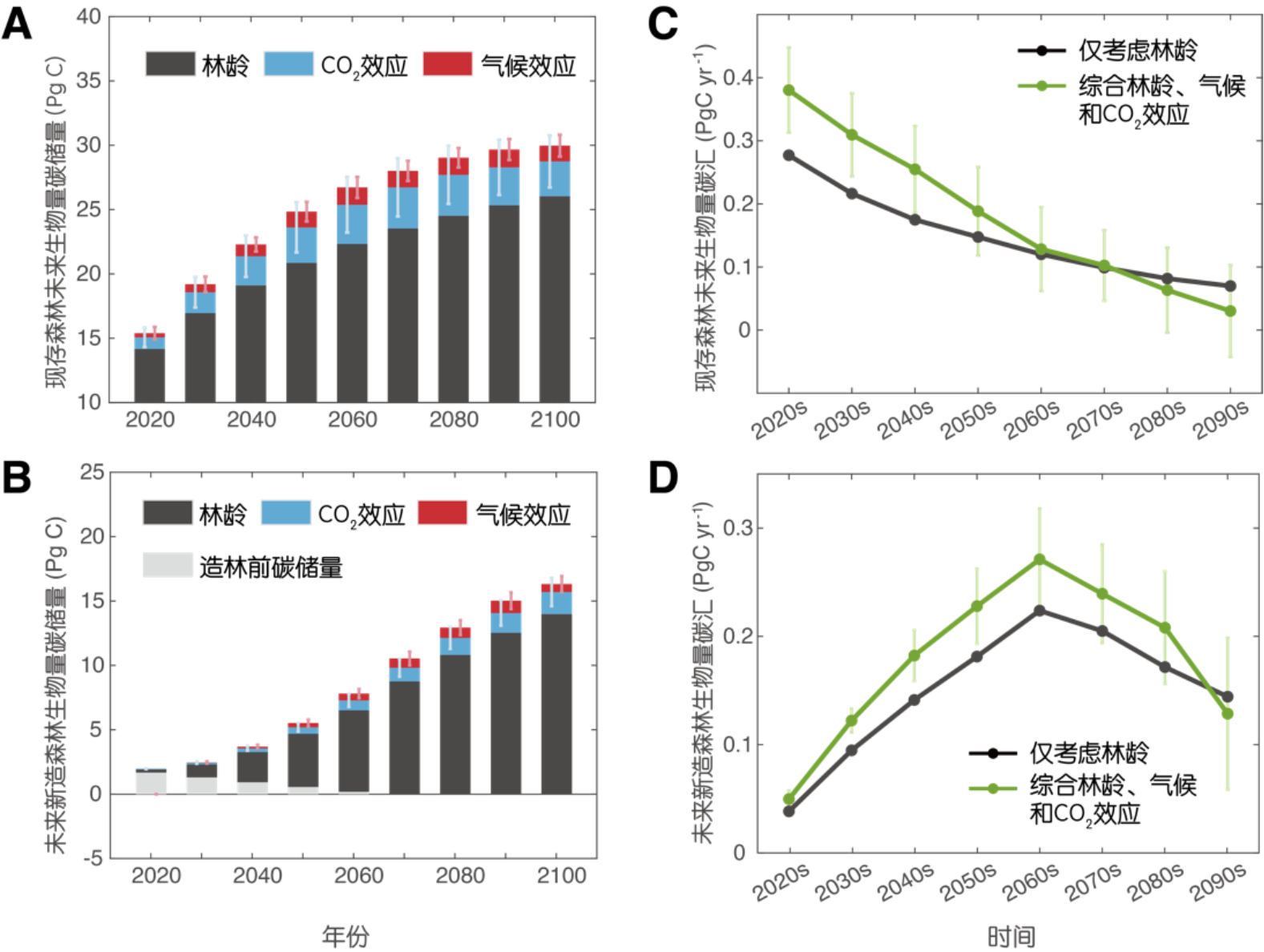 图2.中国现存森林及未来新造森林的生物量碳储量及碳汇变化预估