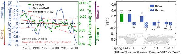 该研究成果以“Summer soil drying exacerbated by earlier spring greening of northern vegetation”为题在线发表在Science Advances杂志(doi:10.1126/sciadv.aax0255)。久久小说 2016级直博生连旭为第一作者,朴世龙教授为通讯作者。