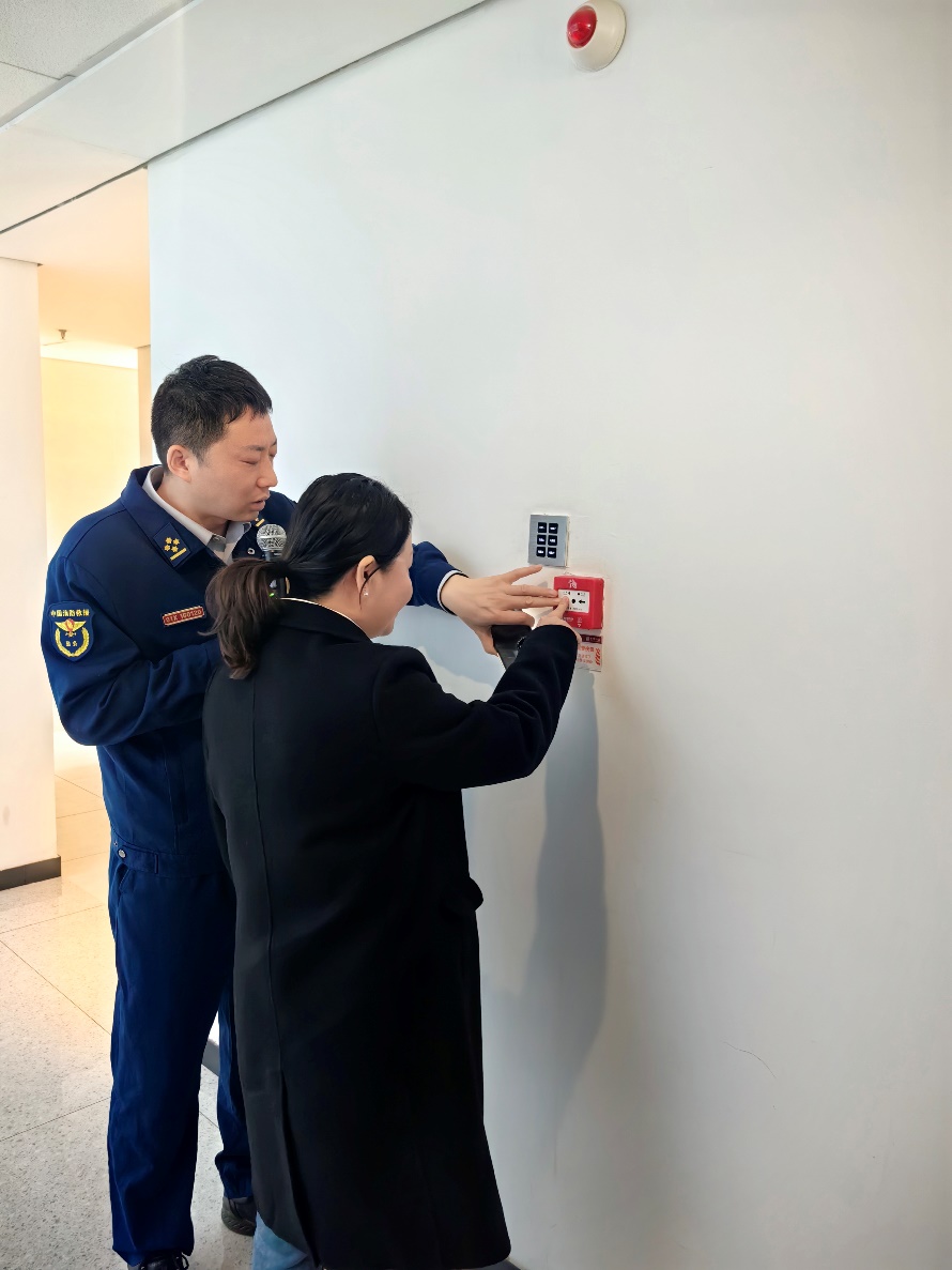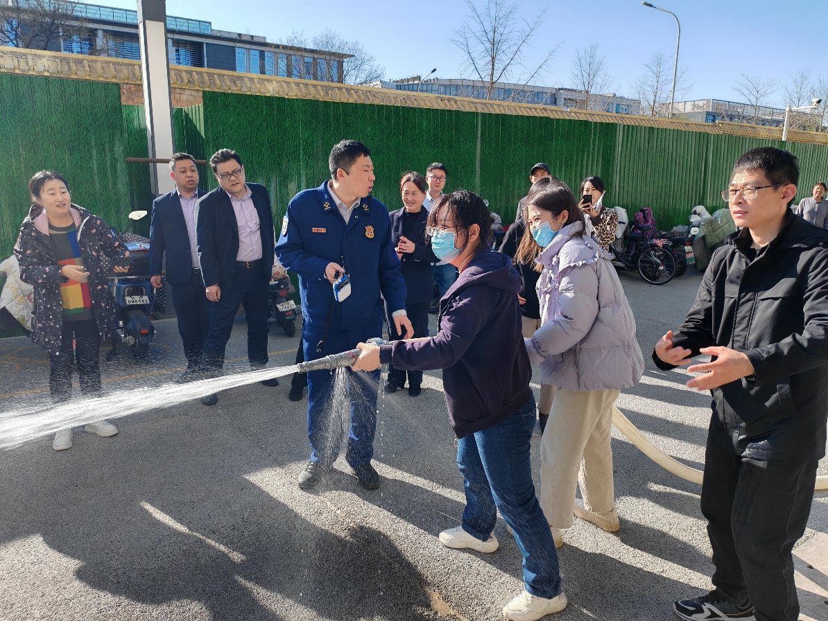 在何健的悉心指导和热情带领下,与会师生了解各种消防器材的用途和使用方法并进行了实操演练,如消防水源和消防水管、灭火器、消防栓、烟雾探测器等。