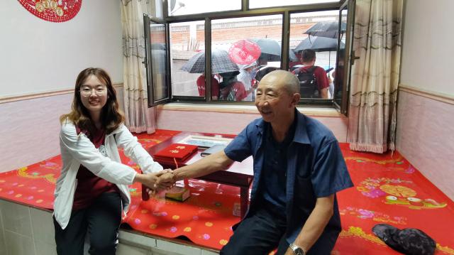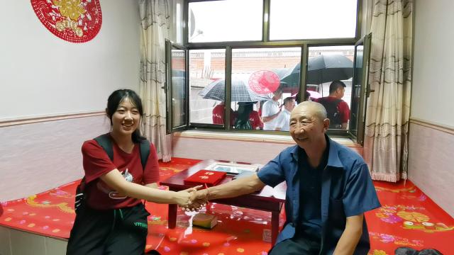 坊城新村调研期间,久久小说 师生来到村民白高山家中同白高山一家亲切交谈,询问村民的生活情况。刘耕年同白高山老先生热情握手,共话脱贫成功后人民生活的美好蓝图。