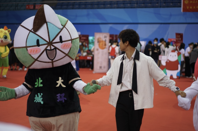 作为迎新的重量级嘉宾,北大城环学院的吉祥物——城小环已早早就位,满怀期待地迎接大家的到来!可爱精巧的指南针造型,蕴含着为新生们指引方向,寻求真理的美好祝福。蓝绿交错的清新配色,也代表了城环学子拥抱美好环境、守护碧水蓝天的愿景。在迎新现场,城小环不出意料地成为团宠和全场“社牛”,不仅积极和新生们合影留念,见证大家在迎新现场的第一抹笑容,还在表演环节主动走上会场中央与嘉宾互动,将城环人的无限热情与满满活力送给所有新生朋友们!